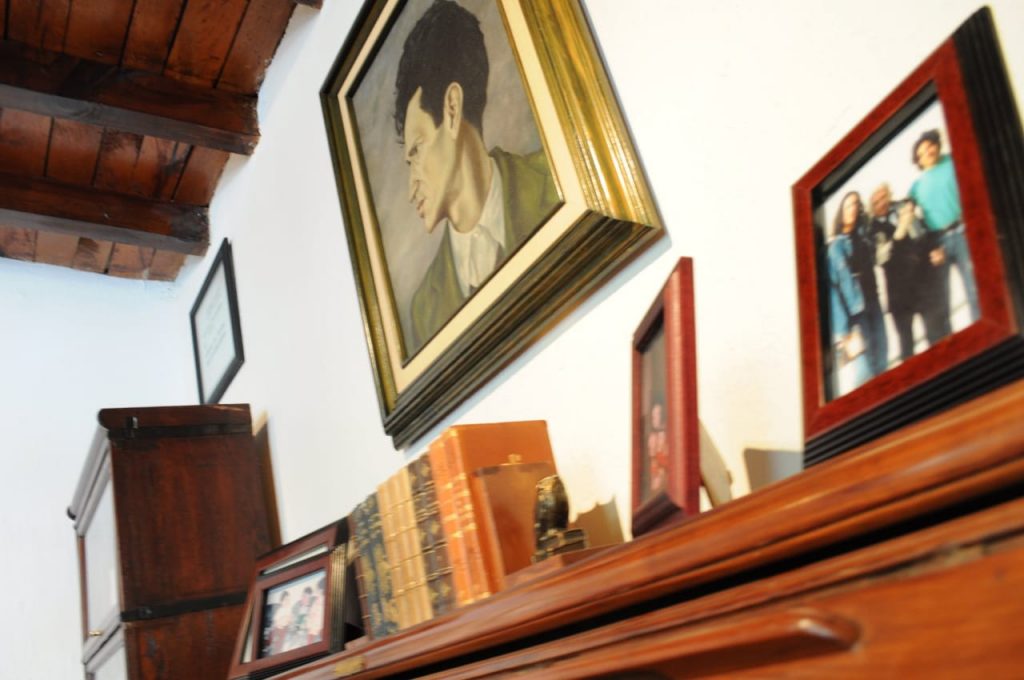Ahí encontrará parte del museo, digo parte porque la casa entera lo es. Baje con cuidado los escalones, que no le gane el deseo de mirar lo que ahí adentro descansa tras las vitrinas. Como es usted un visitante atento y de observación incansable, estudiará rápidamente lo que hay a su alrededor, así su vista pasará ineludiblemente a través de esos gruesos barrotes tintos a su izquierda, donde detrás (en un piso más alto) habrá detectado más libreros, algunos percheros y un escritorio impresionante.