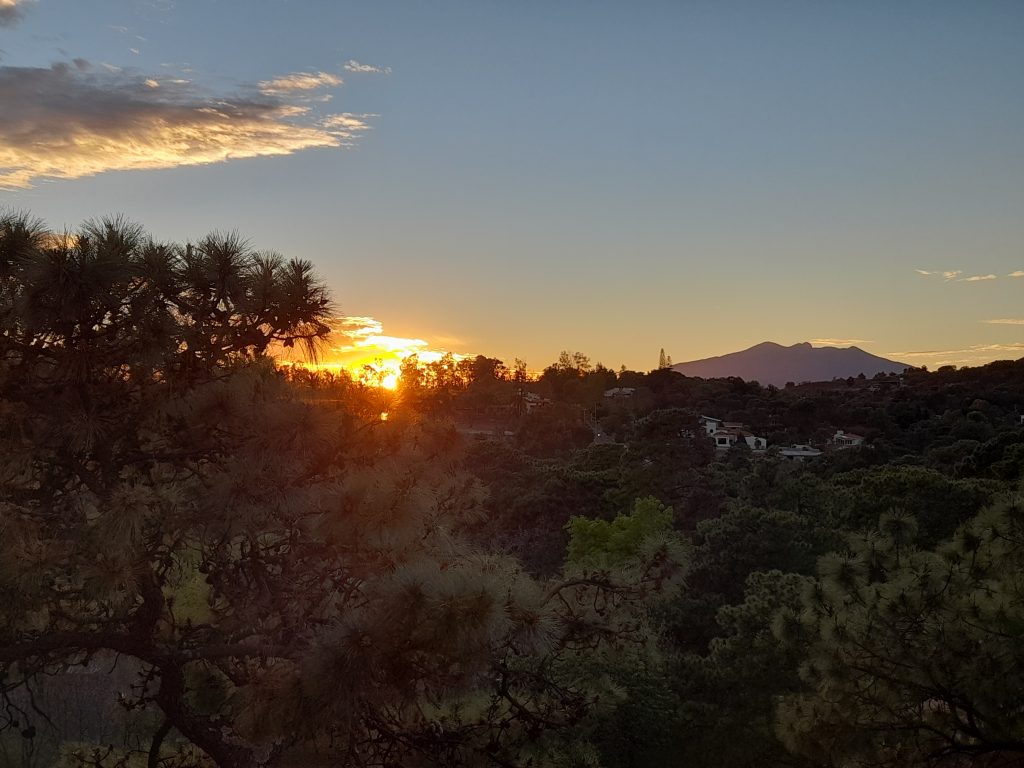 Anoche escuché a un búho cerca de mi ventana. Alguien me dijo que era común que rondaran por estos lugares. Estar rodeada de naturaleza es un privilegio. En medio de la soledad de este aislamiento es tranquilizante poder mirar los robles moverse con el viento, oír a los pájaros cantar todo el día, ver el sol esconderse detrás del volcán de Tequila.