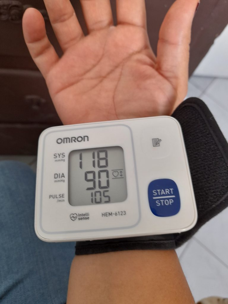 La enfermera Eva acerca una caja de plástico transparente y me enseña cómo funciona el termómetro, a tomarme la presión arterial y a medir mi oxigenación.